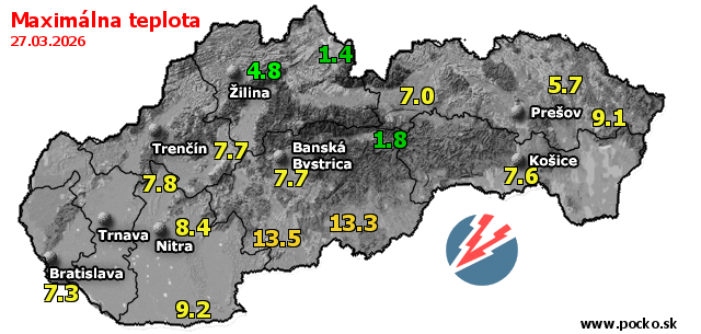 Namerané maximálne teploty z vybraných staníc na Slovensku.