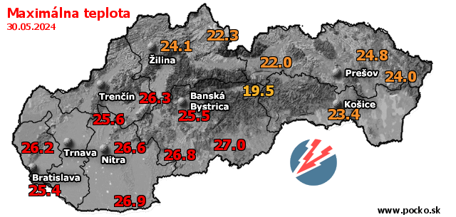 Namerané maximálne teploty z vybraných staníc na Slovensku.