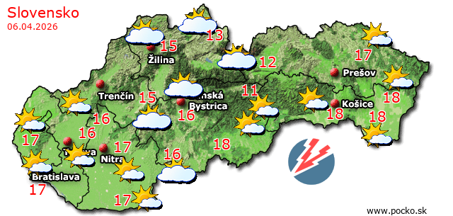 Na Slovensku zajtra očakávame prevažne oblačno. Najnižšie ranné teploty 5 až 1 °C a najvyššie denné teploty 14 až 18 °C, na severe len 10 °C.