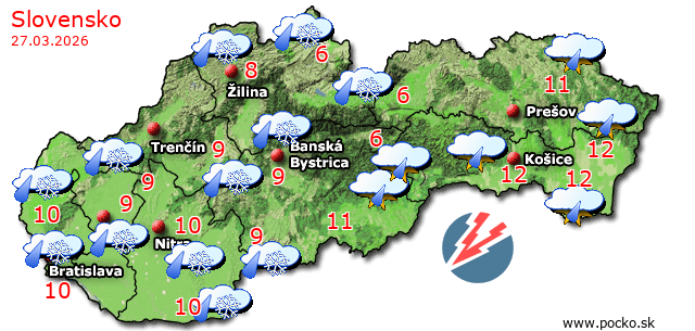 Na Slovensku zajtra očakávame zamračené, dážď so snehom. Najnižšie ranné teploty 3 až -1 °C a najvyššie denné teploty 8 až 12 °C, na severe len 4 °C.