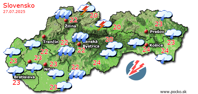 Na Slovensku zajtra očakávame dážď. Najnižšie ranné teploty 17 až 13 °C a najvyššie denné teploty 20 až 24 °C.