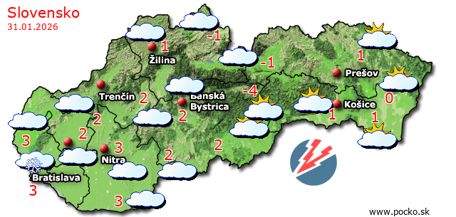 Na Slovensku zajtra očakávame zamračené. Najnižšie ranné teploty -4 až -8 °C a najvyššie denné teploty 0 až 4 °C, na severe len -3 °C.