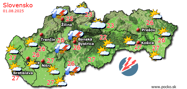 Na Slovensku zajtra očakávame polooblačno, miestami dážď a búrky. Najnižšie ranné teploty 15 až 11 °C a najvyššie denné teploty 24 až 28 °C, na severe len 21 °C.