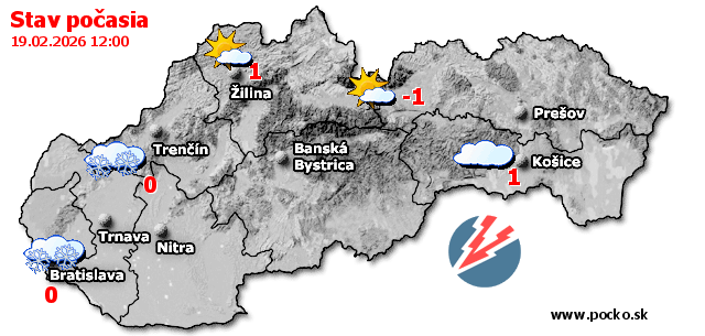 Stav počasia - Slovensko (19.02.2026 o 12.00 hod.)