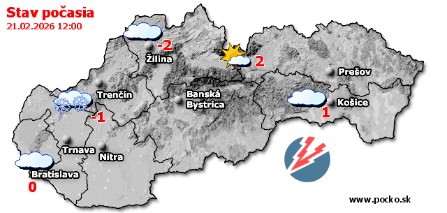 Stav počasia - Slovensko (21.02.2026 o 12.00 hod.)